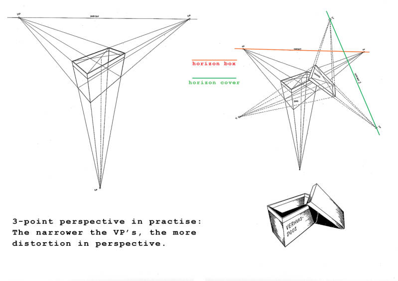 In 1997, when the Twin Towers were still standing, I was fortunate to oversee Manhattan while standing on the terrace on one of them. Maybe many of you have done the same. And, what we saw were many skyscrapers and other buildings, the Hudson and East River with their bridges. Examining one of the nearer skyscrapers, we witnessed the next step in the three dimensions: the upper surface was a square for example. Putting imagination to work, one could see the contours of that square and extend each of the four lines making up that square all the way to the horizon, very much like that crossroads. Two lines go to the left and form a VP, the two others disappear to the right on to the same horizon. But, looking down, there seemed to be a third set of lines, VP and another horizon. If imagination was still working, one could see the skyscraper going on below the ground surface (like the China Syndrome) and disappear to again a single point which is positioned on its own vertical horizon. Enter the three-point perspective (3PP). Looking down like this is called bird's eye view. Turn this whole scenery 180 degrees around and you will have a frog view of a floating skyscraper upside down. Drawing an object transparently, with all those work-lines (WL) to their VP on imaginary horizons in a sketch provides you with a CadCam-like image.